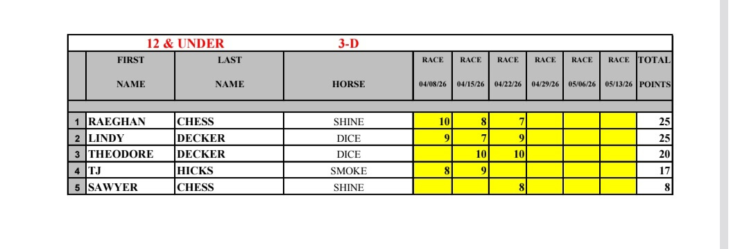 12 & Under #3D Points Summary 4-26